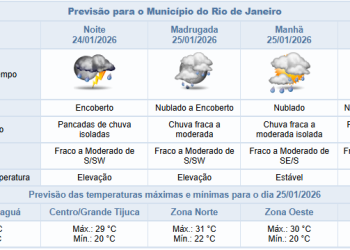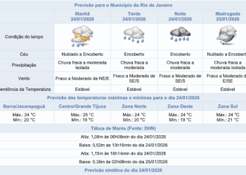 Noticias 24 de janeiro de 2026 Sábado (24/01) tem previsão de chuva fraca e termômetros marcando máxima de 25°C na cidade do Rio