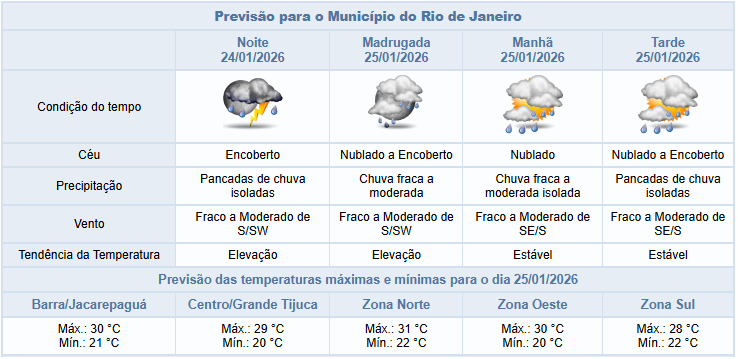 Segundo o Alerta Rio, nesta noite de sábado (24/01), o céu estará nublado a encoberto e há previsão de pancadas de chuva isoladas podendo vir com raios.