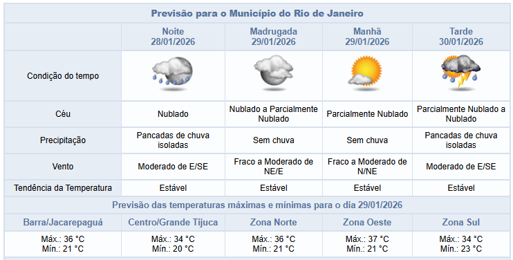 Segundo o Alerta Rio, a previsão para a noite desta quarta-feira (28/01) é de céu nublado, com pancadas de chuva isoladas e ventos moderados. Ao longo do dia, a nebulosidade esteve variada e até o momento não houve registro de chuva. Os ventos estiveram fracos a moderados e as temperaturas permaneceram estáveis e elevadas, com mínima registrada de 19,6°C e máxima registrada de 36,9°.