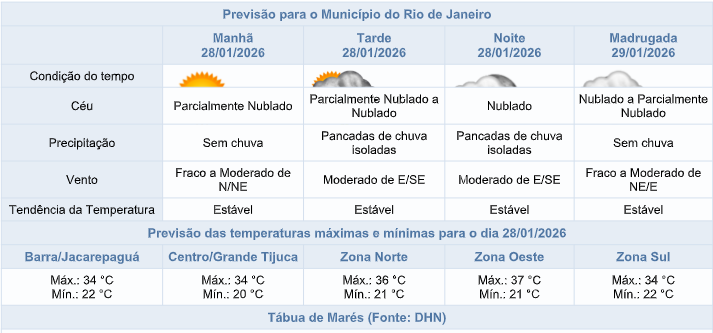 De acordo com o Sistema Alerta Rio, o tempo nesta quarta-feira (28/01), na cidade do Rio, se mantêm instável. O céu estará nublado a parcialmente nublado e há previsão de pancadas de chuva isoladas a partir da tarde, acompanhadas de raios. Os ventos estarão moderados e as temperaturas se elevadas, com mínima prevista de 20°C e máxima prevista de 37°C.