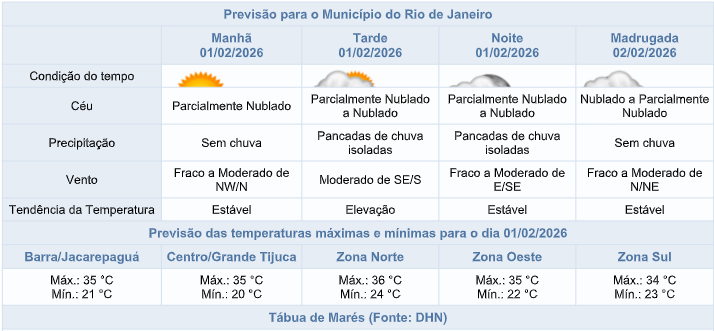 Segundo o Sistema Alerta Rio, o domingo (1/2) será de tempo instável na capital fluminense. A previsão é de céu nublado a parcialmente nublado, com pancadas de chuva a partir da tarde. Os ventos estarão fracos a moderados e as temperaturas se mantêm elevadas, com máxima prevista de 36°C.