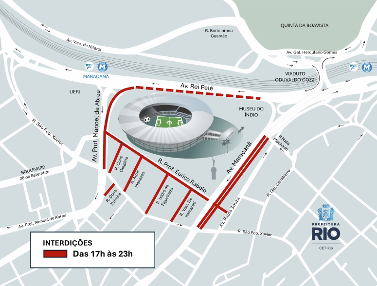 O Centro de Operações e Resiliência da Prefeitura do Rio (COR-Rio) informa que um esquema especial de trânsito será realizado nesta quarta-feira(04/2), para a partida entre Flamengo e Internacional pelo Campeonato Brasileiro, às 19h, no estádio do Maracanã. A partir das 17h, haverá interdição ao trânsito de veículos no entorno do estádio.