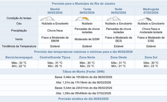 Segundo o Sistema Alerta Rio, um canal de umidade sobre a Região Sudeste segue influenciando as condições de tempo na cidade do Rio de Janeiro, nesta sexta-feira (06/02). A previsão é de céu nublado, com possibilidade de chuva fraca nesta manhã e pancadas de chuva a partir da tarde. Os ventos estarão fracos a moderados e as temperaturas estáveis, com máxima prevista de 32°C.