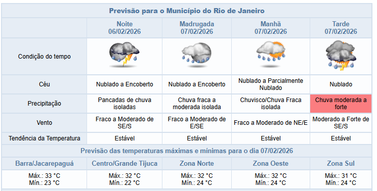 Segundo o Alerta Rio, neste final de tarde e na noite desta sexta-feira (06/02), o céu estará nublado a encoberto na cidade do Rio e há previsão de pancadas de chuva, podendo vir acompanhadas de raios. Ao longo do dia, a temperatura mínima registrada foi de 21,8°C e a máxima de 31°C.