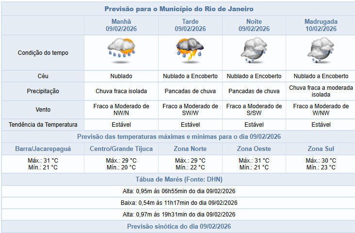 Na terça-feira (10/02), o tempo permanece instável e a previsão é de predomínio de céu nublado e chuva fraca a moderada isolada a qualquer momento do dia. Os ventos estarão fracos a moderados.