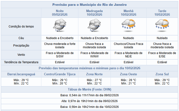 Na terça-feira (10/02), o tempo permanece instável na cidade do Rio e a previsão é de predomínio de céu nublado e chuva fraca a qualquer momento do dia, sendo moderada nos períodos da madrugada e tarde. Os ventos estarão fracos a moderados.
