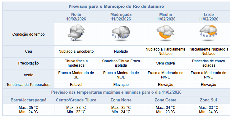 Segundo o Alerta Rio, o céu estará nublado a encoberto na cidade do Rio nesta noite de terça-feira (10/2) e há previsão de chuva fraca a moderada isolada. Ao longo do dia, o tempo permaneceu instável, os ventos estiveram fracos a moderados e as temperaturas apresentaram elevação, com mínima registrada de 20,5°C e máxima registrada de 33°C.