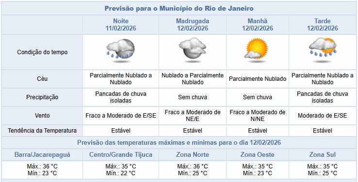 Segundo o Alerta Rio, a previsão para a noite desta quarta-feira (11/02) é de pancadas de chuvas isoladas, com ventos fracos a moderadose céu parcialmente nublado a nublado.