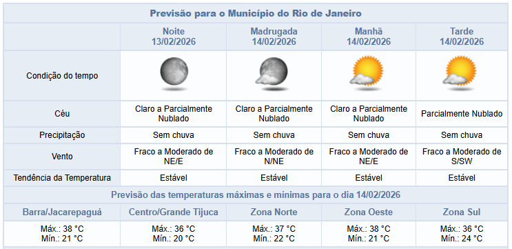 Segundo o Alerta Rio, a noite desta sexta-feira (13/02) será de céu clado a parcialmente nublado, sem chuva e com ventos fracos a moderados. Ao longo do dia, o tempo na cidade do Rio foi influenciado pelo posicionamento de um sistema de alta pressão no oceano, o que resultou em poucas nuvens e nenhum registro de chuva. Os ventos estiveram fracos a moderados e as temperaturas permaneceram estáveis e elevadas, com mínima registrada de 21,0°C e máxima registrada de 39,2°C.