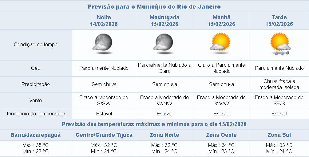 Segundo o Sistema Alerta Rio, na noite deste sábado (14/02), o céu estará parcialmente nublado a claro na cidade do Rio e não há previsão de chuva. Os ventos estarão fracos a moderados.