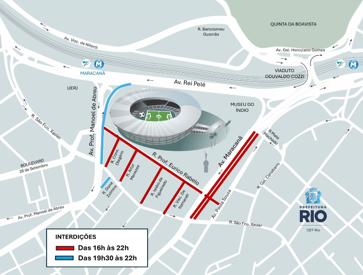O planejamento de trânsito contará com agentes da CET-Rio e apoiadores de tráfego, veículos operacionais e motocicletas que estarão empenhados na orientação do trânsito. E, ainda, no reforço das informações do tráfego, 13 painéis de mensagens variáveis informarão sobre os horários dos fechamentos e as rotas alternativas. Todo o conjunto a favor da segurança viária, fluidez do trânsito, manutenção dos cruzamentos livres, como também, na orientação dos pedestres, torcedores e motoristas.