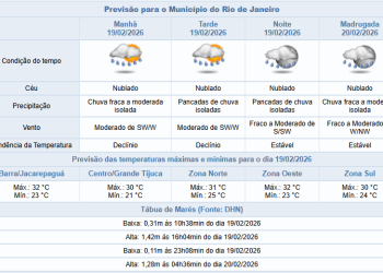 Noticias 19 de fevereiro de 2026 Quinta-feira (19/02) com previsão de chuva ao longo do dia, na cidade do Rio; pancadas a partir da tarde