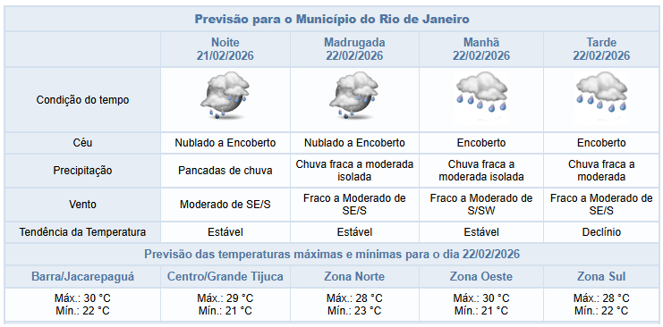 Segundo o Alerta Rio, neste final de tarde e noite de sábado (21/02) o céu estará nublado na cidade do Rio e há previsão de pancadas de chuva isoladas, podendo vir com raios. Os ventos estarão moderados. Ao longo do dia, as temperaturas permaneceram estáveis, com mínima registrada de 22,5°C  e máxima de 33,2°C.