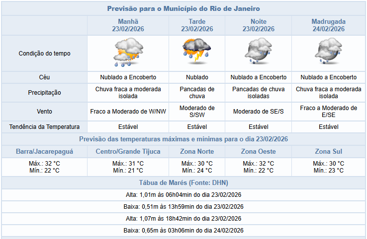 Segundo o Alerta Rio, há possibilidade de chuva fraca a moderada, isolada, durante a manhã desta segunda-feira (23), devido à entrada de umidade do oceano e a atuação de áreas de instabilidade na cidade do Rio de Janeiro. Há possibilidade de pancadas de chuva a partir da tarde. O céu vai ficar nublado e as temperaturas estáveis, com máxima de 32ºC. Ventos fracos a moderados.