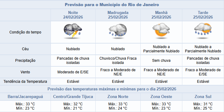 Na quarta-feira (25/02), o tempo segue instável na cidade do Rio. A nebulosidade estará variada e há previsão de chuvisco/chuva fraca isolada na madrugada e pancadas isoladas de chuva na tarde/noite, podendo vir com raios. Os ventos estarão moderados.