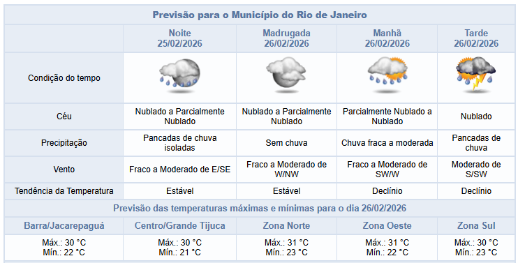 Segundo o Alerta Rio, a previsão para a noite desta quarta-feira (25/02) é pancadas de chuva isoladas, com céu nublado a parcialmente nublado e ventos fracos a moderados. Ao longo do dia, o céu esteve parcialmente nublado na cidade. Os ventos ficaram fracos a moderados e as temperaturas permaneceram estáveis em relação ao dia anterior, com mínima registrada de 21°C e máxima registrada de 34°C.