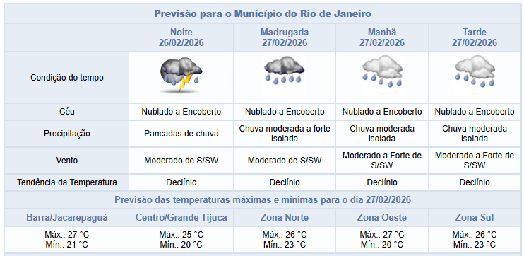 Na sexta-feira (27/2), com a atuação de um sistema de baixa pressão no litoral do estado, a previsão para a capital fluminense é de céu nublado a encoberto e chuva moderada/forte na madrugada, passando a chuva moderada isolada na manhã/tarde, com ventos moderados a ocasionalmente fortes.
