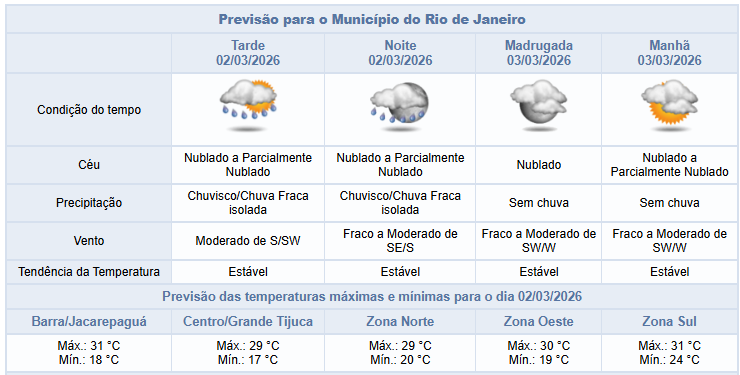 Na terça-feira (03/03), ventos úmidos do oceano manterão o tempo instável na cidade do Rio. Assim, a nebulosidade estará variada e há previsão de chuvisco/chuva fraca isolada na madrugada e no período da noite. Os ventos estarão fracos a moderados.