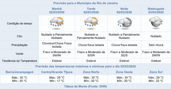 De acordo com o Sistema Alerta Rio, esta segunda-feira (02/03) será mais um dia de tempo instável em função da entrada de ventos úmidos do oceano. A nebulosidade permanecerá variada e há previsão de chuva fraca de forma isolada a qualquer momento. Os ventos estarão fracos a moderados e as temperaturas estáveis, com mínima prevista de 17°C e máxima prevista de 30°C.
