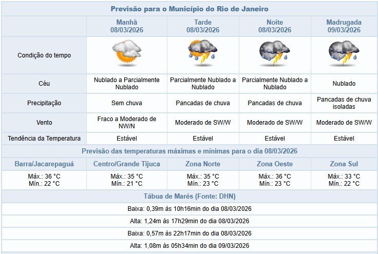 Segundo o Alerta Rio, neste domingo (8/3), há previsão de pancadas de chuva moderada a forte, podendo vir acompanhadas de raios a partir do período da tarde. O tempo será influenciado pela chegada de uma frente fria e a nebulosidade estará variada. Os ventos estarão predominantemente moderados e as temperaturas estáveis, com mínima prevista de 21°C e máxima prevista de 36°C.