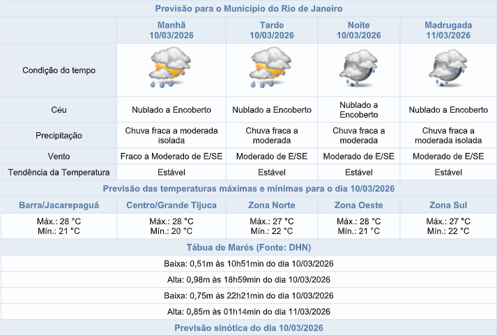 Segundo o Sistema Alerta Rio, esta terça-feira será de tempo instável na capital fluminense por conta do transporte de umidade do oceano em direção ao continente. O céu estará nublado a encoberto e há previsão de chuva fraca a moderada a qualquer momento. Os ventos estarão moderados e as temperaturas estáveis, com máxima prevista de 28°C.