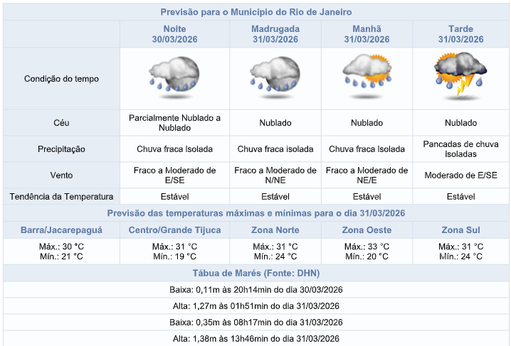 Na terça-feira (31/3), áreas de instabilidade associadas a uma região de baixa pressão em conjunto com a entrada de ventos úmidos do oceano influenciarão o tempo na cidade do Rio. Assim, a nebulosidade estará variada e a previsão é de chuva fraca isolada na madrugada/manhã, passando a pancadas isoladas de chuva moderada a partir da tarde. Os ventos estarão predominantemente moderados.