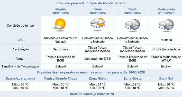 De acordo com o Sistema Alerta Rio, o tempo na capital fluminense, nesta segunda-feira (30/03), será influenciado por áreas de instabilidade em conjunto com a entrada de umidade. A nebulosidade estará variada e há previsão de chuva fraca a moderada a partir da tarde. Os ventos estarão entre fracos a moderados e as temperaturas estarão estáveis, com máxima prevista de 32°C.