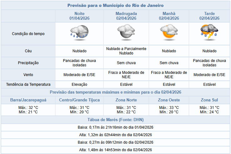 Entre a quinta-feira e a sexta-feira (02 e 03/04), a atuação de áreas de instabilidade em diferentes níveis da atmosfera em conjunto com o calor manterão o tempo instável na cidade do Rio de Janeiro. Assim, o predomínio será de céu nublado e há previsão de pancadas de chuva isoladas na tarde/noite destes dias, podendo vir com raios. Os ventos estarão variando entre fracos e moderados.