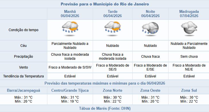 De acordo com o Sistema Alerta Rio, nesta segunda-feira (06/04), a passagem de uma frente fria em alto mar irá influenciar o tempo na capital fluminense. A previsão é de céu nublado com chuva fraca a moderada isolada a partir do final da manhã. Os ventos estarão fracos a moderados e as temperaturas seguem estáveis, com máxima prevista de 31°C.