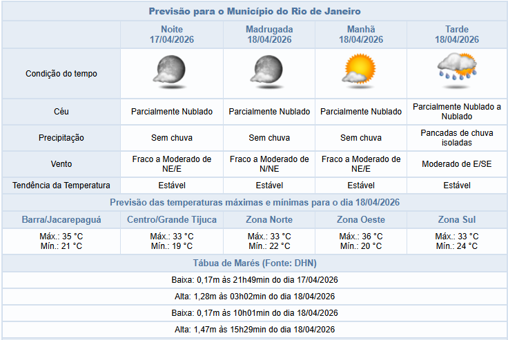 Segundo o Alerta Rio, a previsão para a noite desta sexta-feira (17/04) é de céu parcialmente nublado, com ventos fracos a moderados, e sem chuva. Ao longo do dia, a nebulosidade esteve variada na cidade e não houve registro de chuva. Os ventos ficaram fracos a moderados, e as temperaturas apresentaram leve elevação em relação ao dia anterior, com mínima registrada de 18,3°C e máxima registrada de 34,2°C.