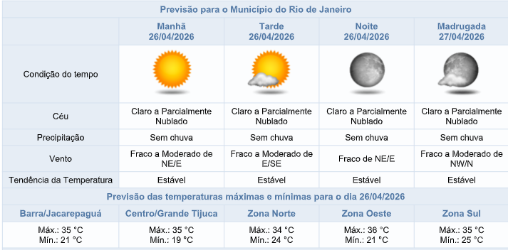 De acordo com o Sistema Alerta Rio, neste domingo (26/04), o tempo na capital fluminense se mantêm influenciado por um sistema de alta pressão. O céu terá poucas nuvens, não há previsão de chuva e os ventos estarão fracos a moderados. A umidade relativa do ar poderá apresentar valores entre 21% e 30% no período da tarde e as temperaturas seguem elevadas, com máxima prevista de 36°C.