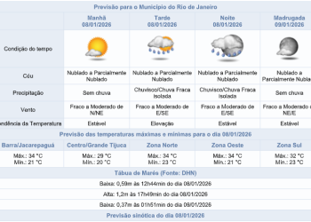 Noticias 8 de janeiro de 2026 Quinta-feira (08/01) com previsão de chuva fraca e aumento da temperatura na cidade do Rio